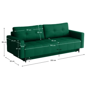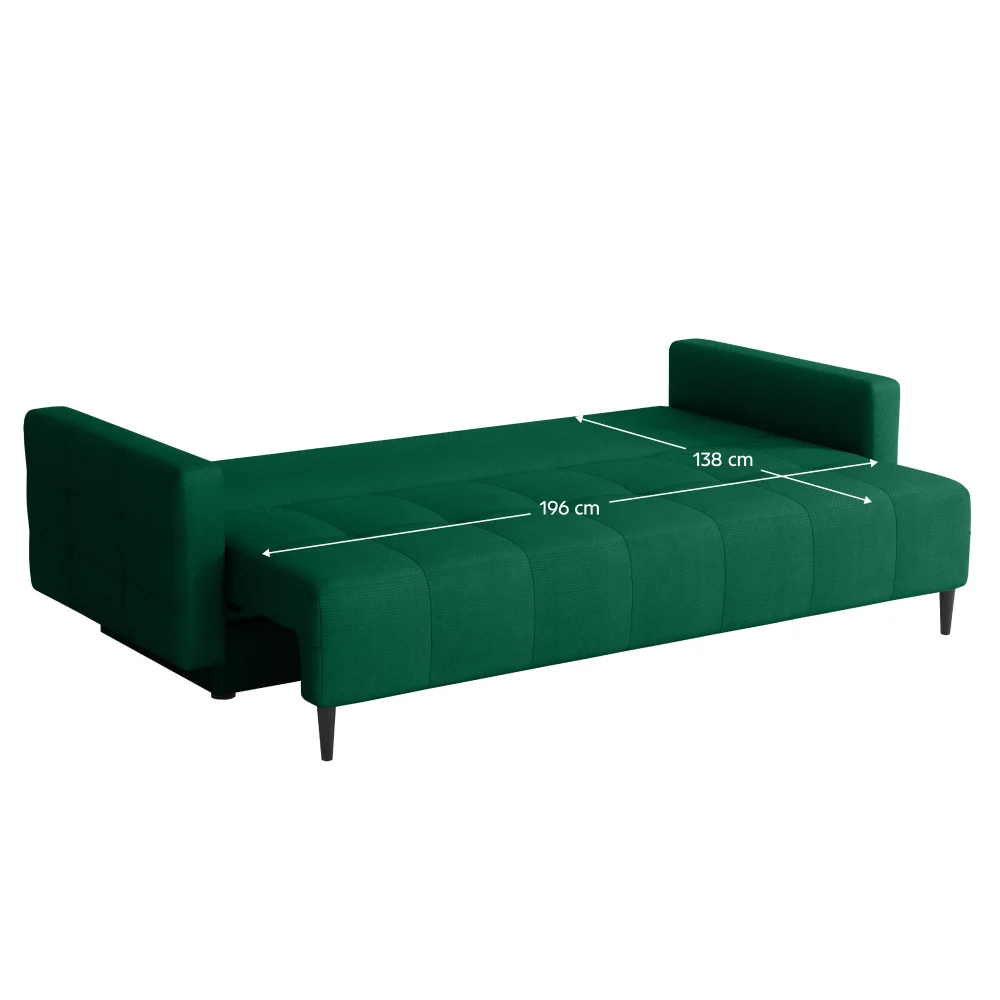 Funcția de extensie transformă rapid canapeaua într-un spațiu generos de dormit, cu dimensiunea de 138 × 196 cm, ideal pentru oaspeți sau pentru utilizare zilnică. În plus, canapeaua extensibilă verde DORY dispune de spațiu de depozitare integrat, perfect pentru lenjerii, pături sau perne, contribuind la menținerea unui living ordonat.