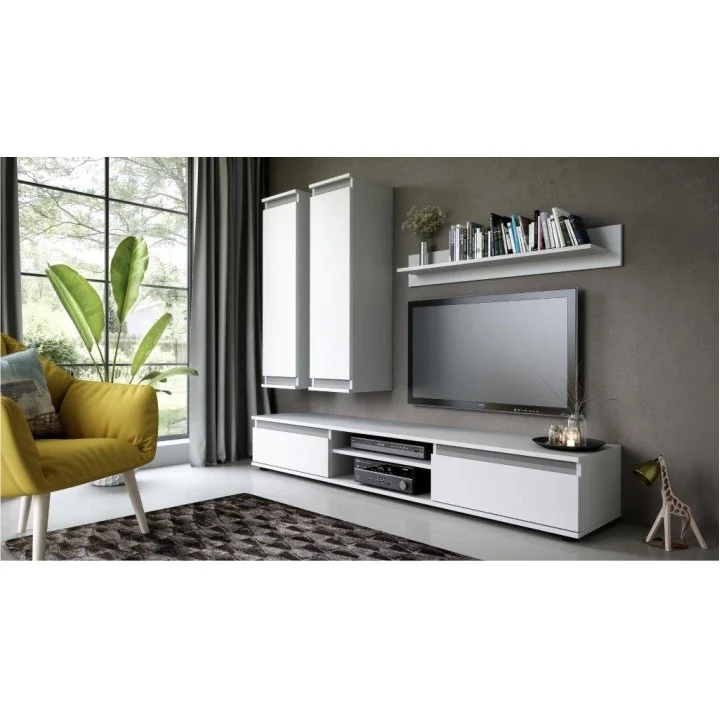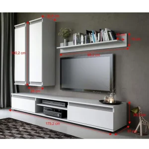 Acest set cuprinde masa pentru TV, poliţă dublă si două dulapuri. Mobila este ideala pentru sufrageria unui apartament si puteti astfel economisi spatiu. Combinatia este una eleganta si ofera locuintei dumneavoastra un aspect tineresc.