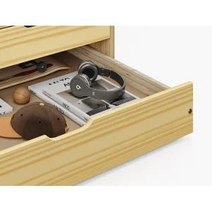 Descriere: Pat şi pat suplimentar (partea inferioară cu rotiţe), trei sertare, lamele pe patul superior, fundurile sertarelor şi lamelele patului suplimentar din placaj
