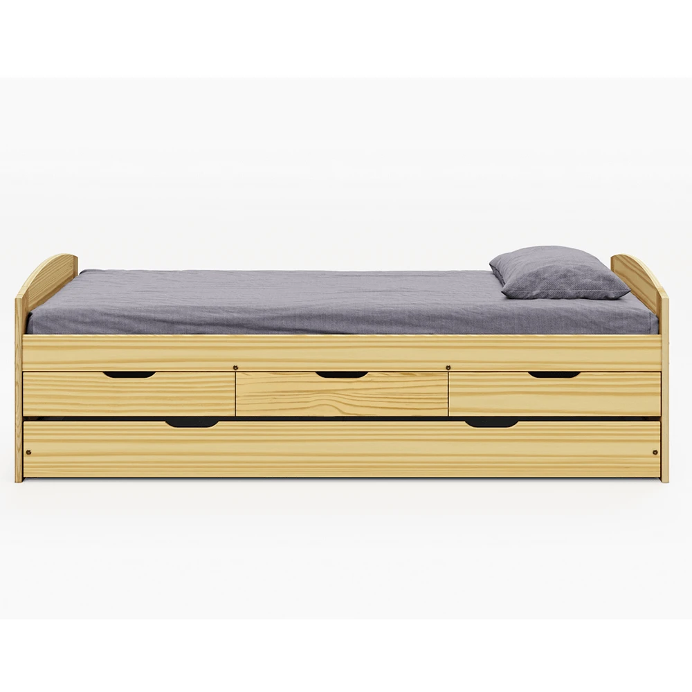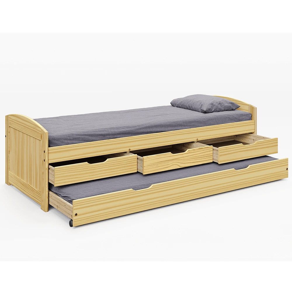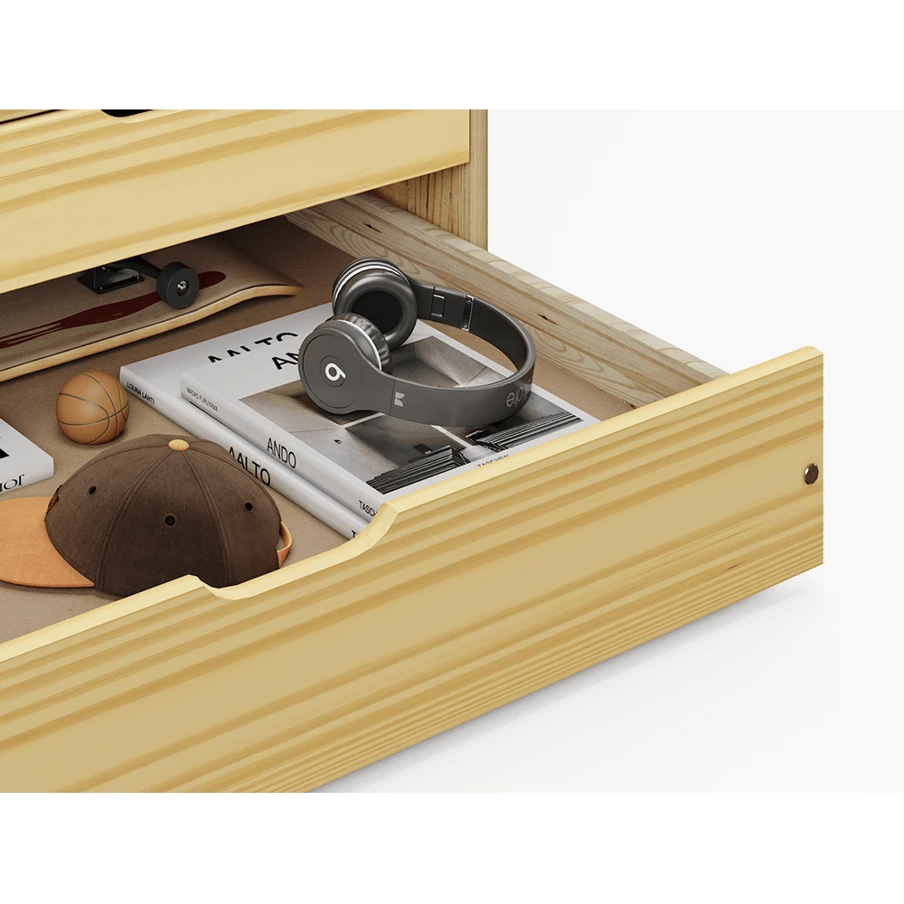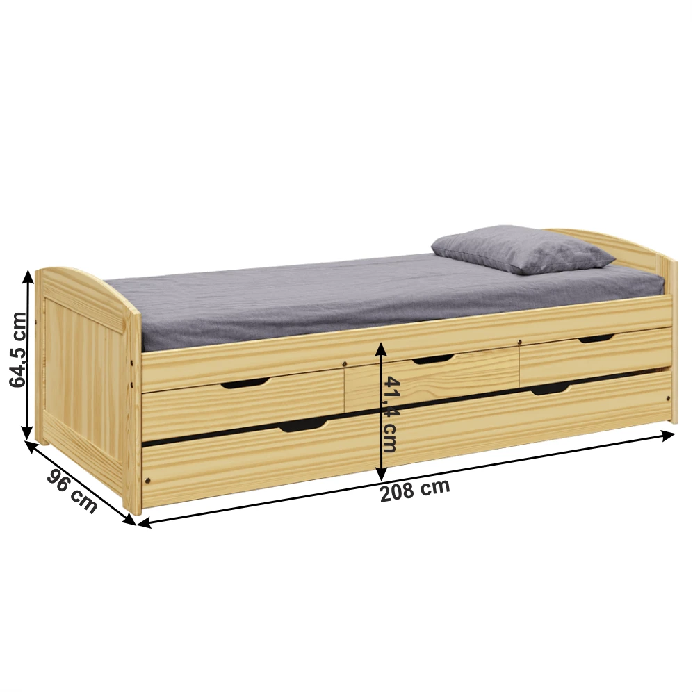 Descriere: Pat şi pat suplimentar (partea inferioară cu rotiţe), trei sertare, lamele pe patul superior, fundurile sertarelor şi lamelele patului suplimentar din placaj
