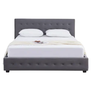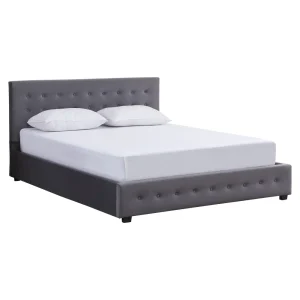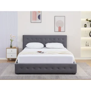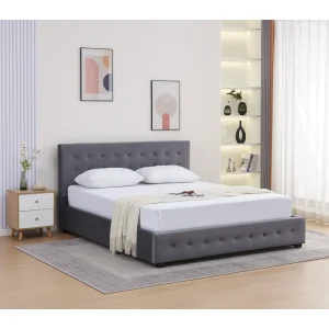 Acest pat are o tăblie frontală matlasată decorativ, care adaugă un plus de rafinament încăperii. Culoarea gri este versatilă și ușor de integrat în diferite stiluri de amenajare, de la contemporan la minimalist.