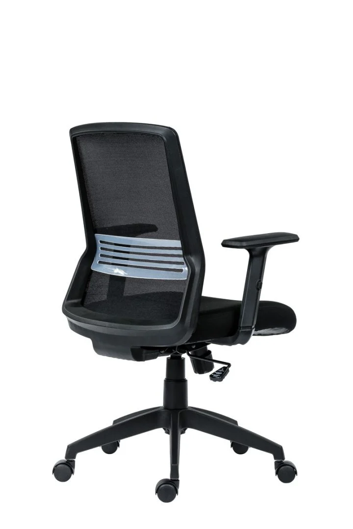 Spătarul este construit pe un cadru din polipropilenă, rezistent la șocuri, și este tapițat cu mesh pentru o bună circulație a aerului. Scaunul dispune de mecanism sincron (cu o singură manetă), permițând blocarea în poziție orizontală și reglarea înălțimii șezutului.